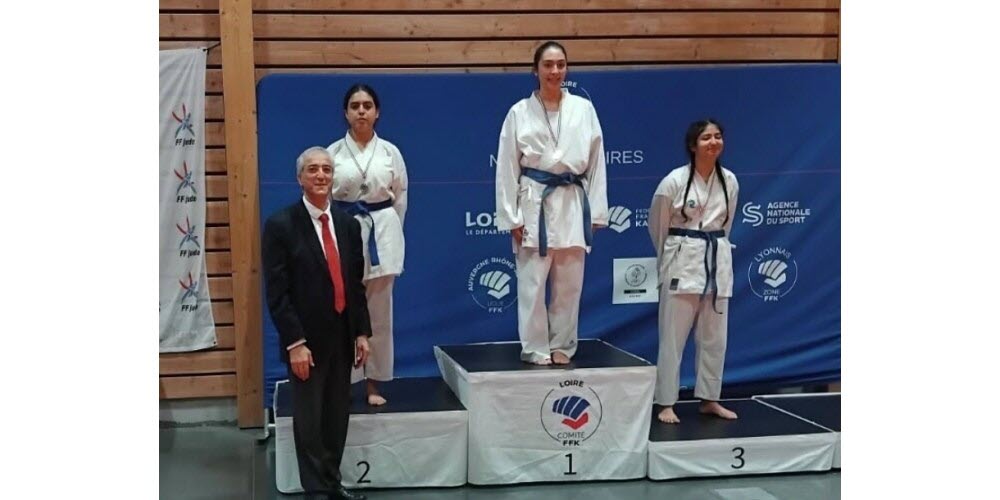 Crédit photo : La jeune Maram sur le podium des championnats de la Loire de karaté. Photo fournie par la MJC